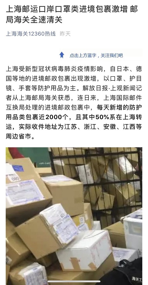 海關總署1月27日發(fā)出通知,對聲明涉及疫情物資的郵件快件,可以采取個案處理方式,優(yōu)先辦理報關手續(xù)。為加速進出境郵件中口罩、護目鏡、手套等肺炎疫情防護用品的清關速度,上海郵局海關對外公布春節(jié)期間24小時聯(lián)系電話:021-56355716。相關防護用品郵件的寄收件人如有需求,可致電詳細報告郵件號碼,海關將即時進行快速驗放。