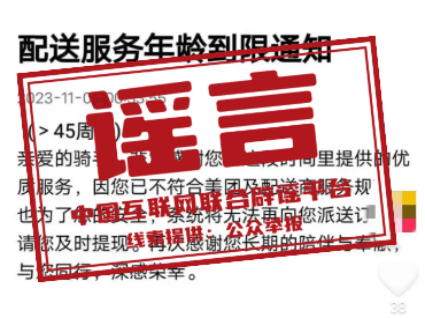真相:近日,一張“配送服務年齡到限通知”的截圖在網絡流傳,稱“年齡超過45歲后,就不再符合某外賣平臺及配送服務商的服務規(guī)范,系統(tǒng)將不再派送訂單”。經向該外賣平臺核實,此信息為謠言。該平臺工作人員在接受記者采訪時稱,考慮到配送過程中相關安全因素,會對騎手的年齡限制在18周歲至57周歲之間,在此年齡范圍內,且具有完全民事行為能力和相應的獨立勞動能力,身體健康、持有有效健康證且無相關類型疾病,符合無違法犯罪記錄、熟練駕駛相關車輛等要求的人員均可注冊為網約配送員,網傳“配送員年齡上限為45歲”系虛假信息。(來源:北京網絡辟謠、上海網絡辟謠、湖北網絡辟謠)