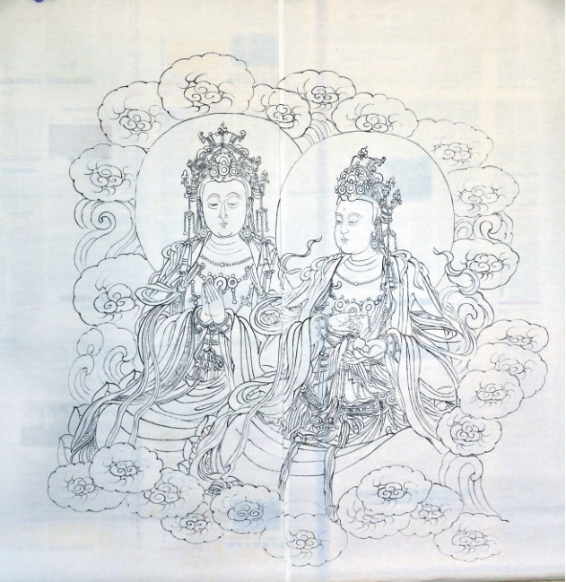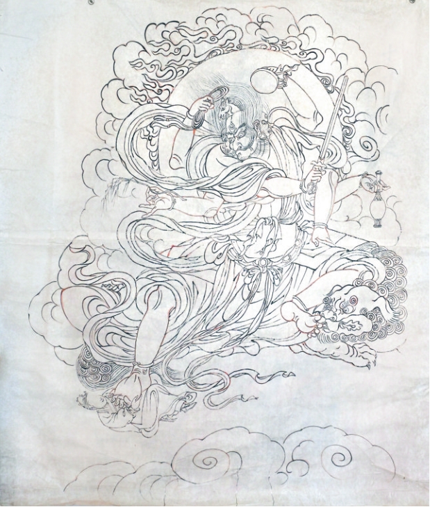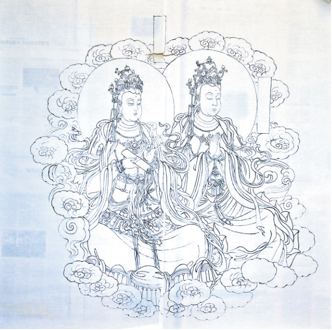 在李向東看來(lái),臨寫是為了學(xué)習(xí)而不是“復(fù)制”壁畫。面對(duì)殘破或年久漫漶不清的畫面,他從蛛絲馬跡入手反復(fù)揣摩,根據(jù)壁畫整體的線描、造型特點(diǎn),一一補(bǔ)而畫之,最后定稿。從這個(gè)意義上說,李向東也使殘破的公主寺壁畫得以復(fù)原,“補(bǔ)壁”之功不可小覷。