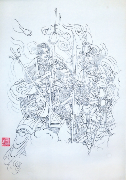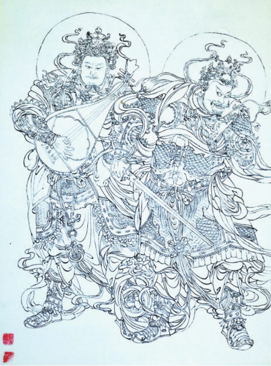 更令李向東醉心不已的是,壁畫中人物衣袖明明是靜態(tài),卻似乎被微風(fēng)吹動(dòng)、卷起形成鼓動(dòng)之勢(shì),仿佛下一秒就要隨風(fēng)起舞。在靜止的壁畫中,畫師勾勒出搖動(dòng)的扇面、飛舞的發(fā)絲,以及在眾仙家之間縹緲虛幻的云海,創(chuàng)造了靈動(dòng)出畫的動(dòng)態(tài)美。眾神佛道三五成群,看似錯(cuò)落隔離,卻又遙相呼應(yīng),彼此相望,顧盼生輝,呼之欲出。在人物群像中,李向東對(duì)金剛座神的畫法最為推崇——面目粗獷,體格魁偉,毛發(fā)濃密,一雙銅鈴般的眼睛微微斜視,須眉怒張,威風(fēng)凜凜。身體重心偏向一側(cè),一手持金剛杵于肩頭,一手探掌護(hù)于胸前,全身肌肉緊繃,顯示出畫師對(duì)線條的熟練運(yùn)用和高超的造型能力。
