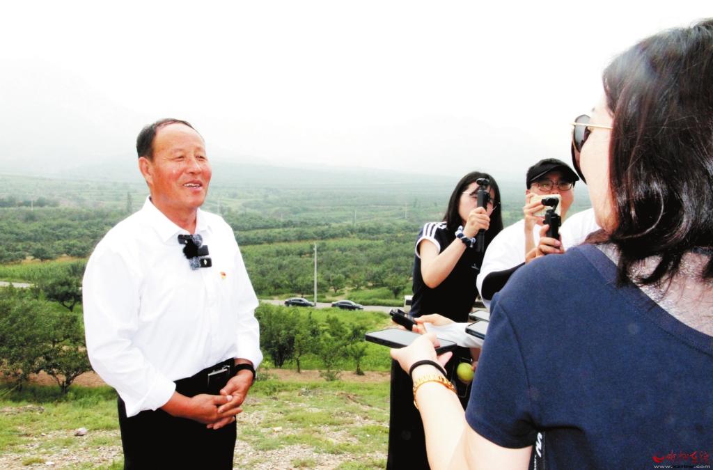 在萬(wàn)畝玉露香酥梨基地觀景臺(tái)上,栗翠田(左一)接受“三晉人大代表采風(fēng)行”記者采訪張林泉攝