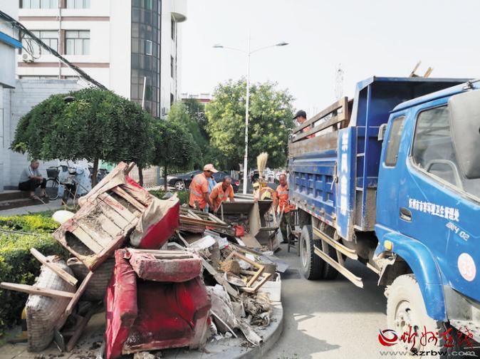 8月2日,忻州城區(qū)環(huán)衛(wèi)工人正在清運(yùn)垃圾。今年是第六屆創(chuàng)建全國(guó)文明城市評(píng)選決勝之年。在市創(chuàng)建全國(guó)文明城市總指揮部的統(tǒng)一協(xié)調(diào)指揮下,結(jié)合當(dāng)前正在開(kāi)展的城區(qū)“兩下兩進(jìn)兩拆雙修一提升”專(zhuān)項(xiàng)整治行動(dòng),近日,各單位和居民小區(qū)清潔環(huán)境,助力創(chuàng)建全國(guó)文明城市。市市容環(huán)境衛(wèi)生管理處組織環(huán)衛(wèi)工人和車(chē)輛對(duì)指定堆放的垃圾進(jìn)行了集中清運(yùn)。 張劍雄 攝