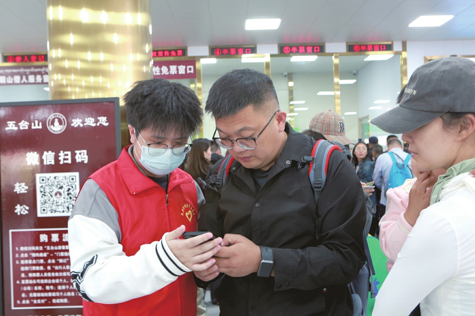 五臺(tái)山游客服務(wù)中心大廳內(nèi),志愿者正在協(xié)助游客網(wǎng)上購(gòu)票。李春澤攝