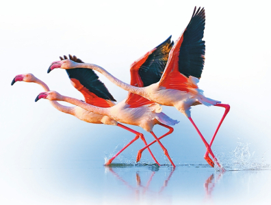 11月23日,初冬的運(yùn)城濕地省級自然保護(hù)區(qū)(鹽湖段)水面澄澈,灘涂鋪展,火烈鳥亭亭玉立,時而低頭啄食,時而曲頸戲水,時而平展振翅。