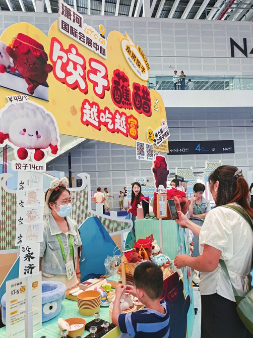 胖乎乎的餃子、圓墩墩的醋缸,摸一摸,毛絨絨的,手感柔順細(xì)滑。8月24日,第七屆山西文博會(huì)現(xiàn)場,位于山西瀟河國際會(huì)展中心N4館的文創(chuàng)山西展區(qū),永濟(jì)市晉韻原創(chuàng)文創(chuàng)工作室獨(dú)特而醒目的門頭——“餃子蘸醋 越吃越富”,吸引了眾多參觀者的目光。該工作室展出的餃子蘸醋系列毛絨文創(chuàng)產(chǎn)品,也受到參觀者的關(guān)注和喜愛。