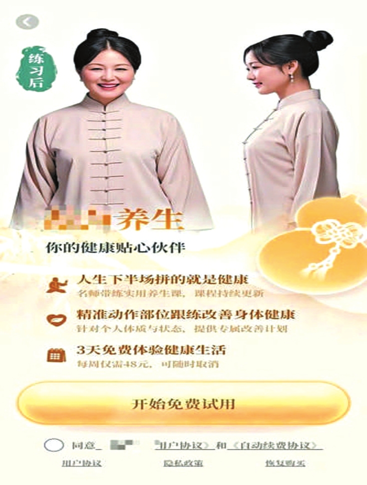 還有些App則更加離譜,下載完成后,點(diǎn)進(jìn)去的第一步就是要購買會員,之后才能正常使用。但在購買流程上,平臺卻耍起了花招。比如一款提供“養(yǎng)生指導(dǎo)服務(wù)”的App,頁面上會有一個(gè)大大的按鈕,寫著“開始免費(fèi)試用”。但在按鈕的旁邊,卻有一行非常不起眼的小字:“每周僅需48元,可隨時(shí)取消?!倍坏┯脩酎c(diǎn)擊開始試用,系統(tǒng)就會跳轉(zhuǎn)到自動續(xù)費(fèi)的開通界面。如果是辨別能力差的老人,可能還以為是在填寫什么注冊信息。