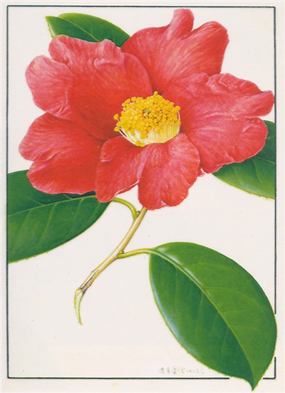 浙江山茶花 紅色花瓣明艷動(dòng)人,皺褶感栩栩如生。倒卵形花瓣頂端的2裂、深綠葉片發(fā)亮的革質(zhì)感以及邊緣的鋸齒都得到完整表現(xiàn),不愧是經(jīng)典之作。馮晉庸繪