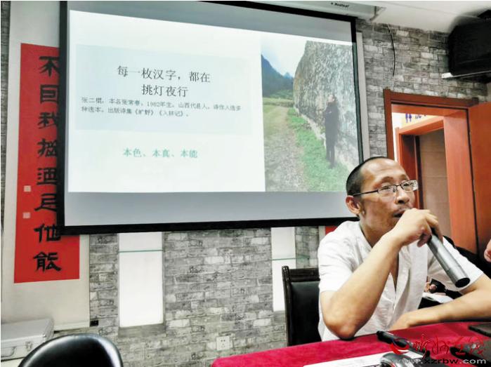 本報訊 8月15日晚,位于忻州市七一北路的好目匠眼鏡店迎來一場文學(xué)盛會。保德縣、岢嵐縣、五寨縣、原平市、定襄縣的詩歌愛好者,與忻州城區(qū)的詩歌愛好者一起聆聽了著名詩人張二棍關(guān)于詩歌創(chuàng)作的講座,甚至有詩歌愛好者專門從北京趕回忻州。當晚,連講座廳外都站滿了聆聽的人。