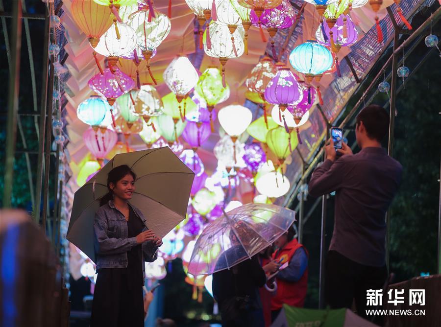 9月29日,游客在龍門古鎮(zhèn)內(nèi)觀賞廟會花燈。 新華社記者 徐昱 攝