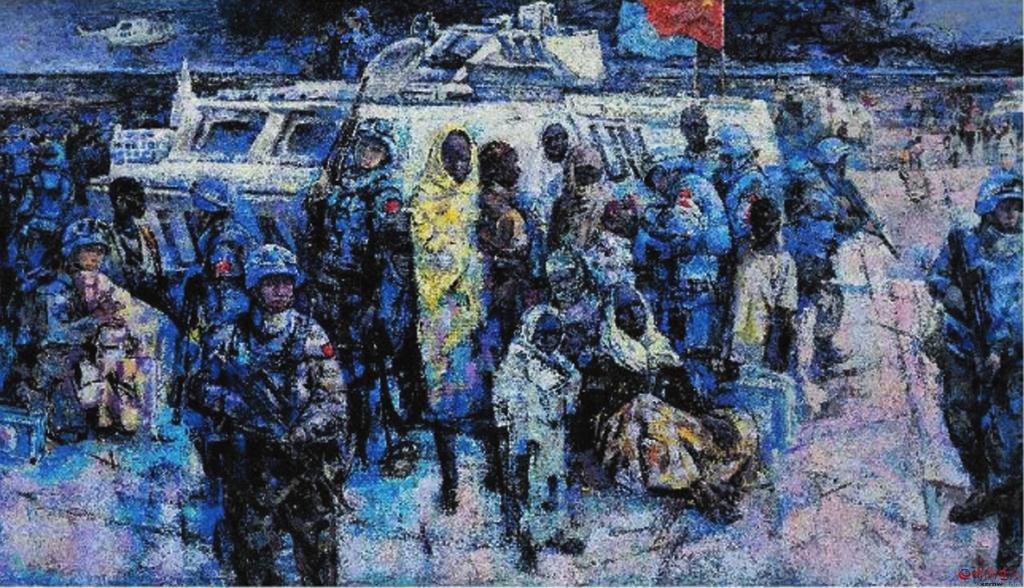 在續(xù)鶴賢眾多的作品中,從畫面表現效果方面,我是比較喜歡《和平使命——藍色交響曲》這幅作品的。無論畫面構圖、色彩關系,還是人物造型以及表現技巧,都堪稱完美。畫面中無論人物形象、動態(tài)、表情,還是人與自然背景,都處在一種和諧美好的關系中,從一個新的角度給予美好詮釋。這幅作品表現的是我們的維和部隊“子弟兵”以自己的生命守護著世界和平,講述著構建人類命運共同體的大國情懷。 (邢晨聲 文)