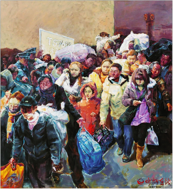 《春潮——回家過年》這幅作品是典型、真實的社會現實和人性本真的寫照,這個瞬間定格了一段讓多少人刻骨銘心的記憶,敘述了周期性的人類大遷徙——春運。該畫所蘊涵的是中國人心中那份最飽滿的希望。旅客是彼此都不認識的陌生人,為了一個回家的目的,毫無距離地擠在一起,人物個性鮮明。畫家具有強大的創(chuàng)作能力和藝術表現力。(邢晨聲 文)