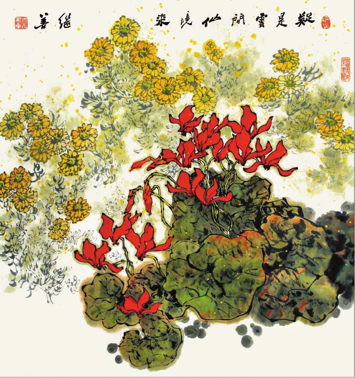 郜繼善的重彩花鳥(niǎo)畫偏傳統(tǒng),筆法細(xì)膩工整,色彩明麗典雅,構(gòu)圖大氣別致,情趣盎然,意境深遠(yuǎn)。作品中各種元素有機(jī)融合,自然穿插,形成和諧有序的布局,讓人既能感受到自然界的豐富與絢爛,又可體味藝術(shù)帶來(lái)的愉悅和感動(dòng)。在他的筆下,重彩成為了最具藝術(shù)感染力的手段,也是最有個(gè)性藝術(shù)特征的語(yǔ)言,鮮明、強(qiáng)烈,可謂“脫盡媚俗寫重彩”。