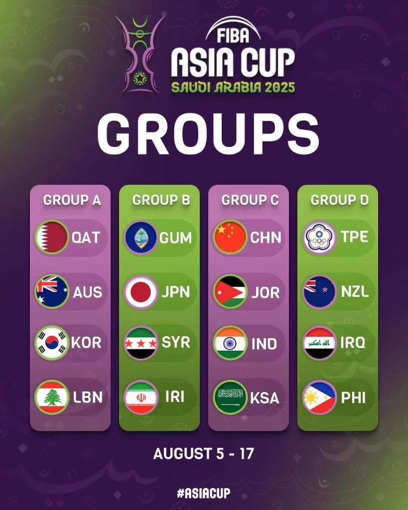 本屆FIBA亞洲杯將于8月5日至17日在沙特阿拉伯吉達舉行。小組賽階段,16支參賽球隊分為4個小組,小組頭名直接晉級八強,獲得小組二、三名的球隊需要進行交叉淘汰賽,取勝的一方入圍四分之一決賽,隨后的比賽采用單場淘汰制。