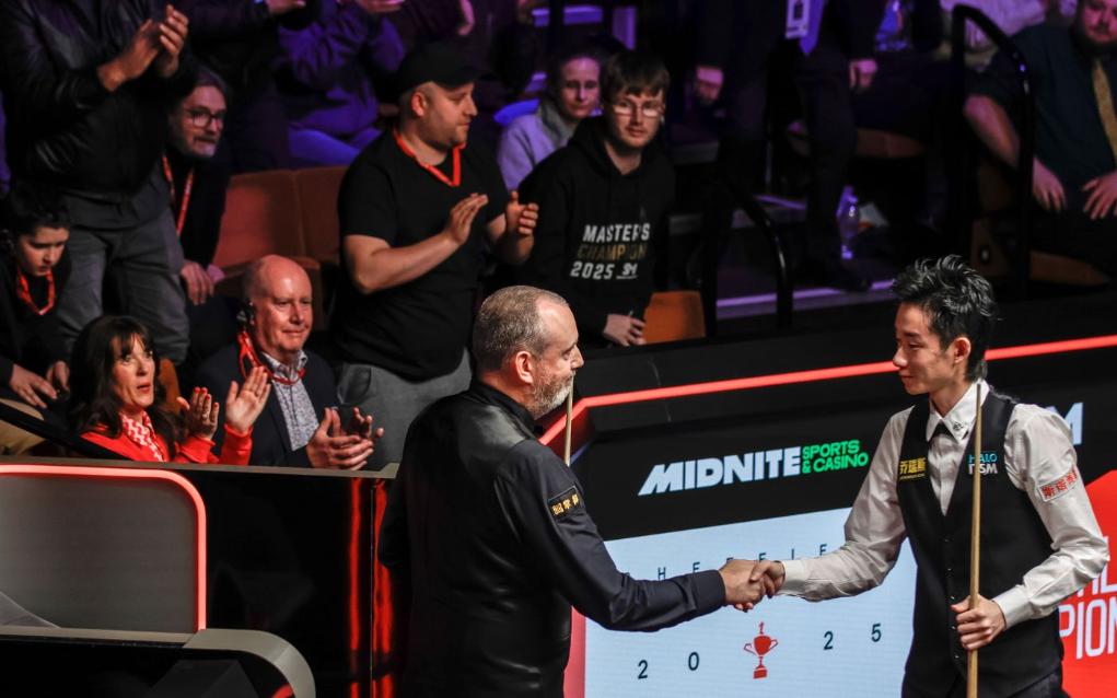 吳宜澤(右)在賽后與對手握手。圖片來源于世界斯諾克巡回賽(WST)官網(wǎng)