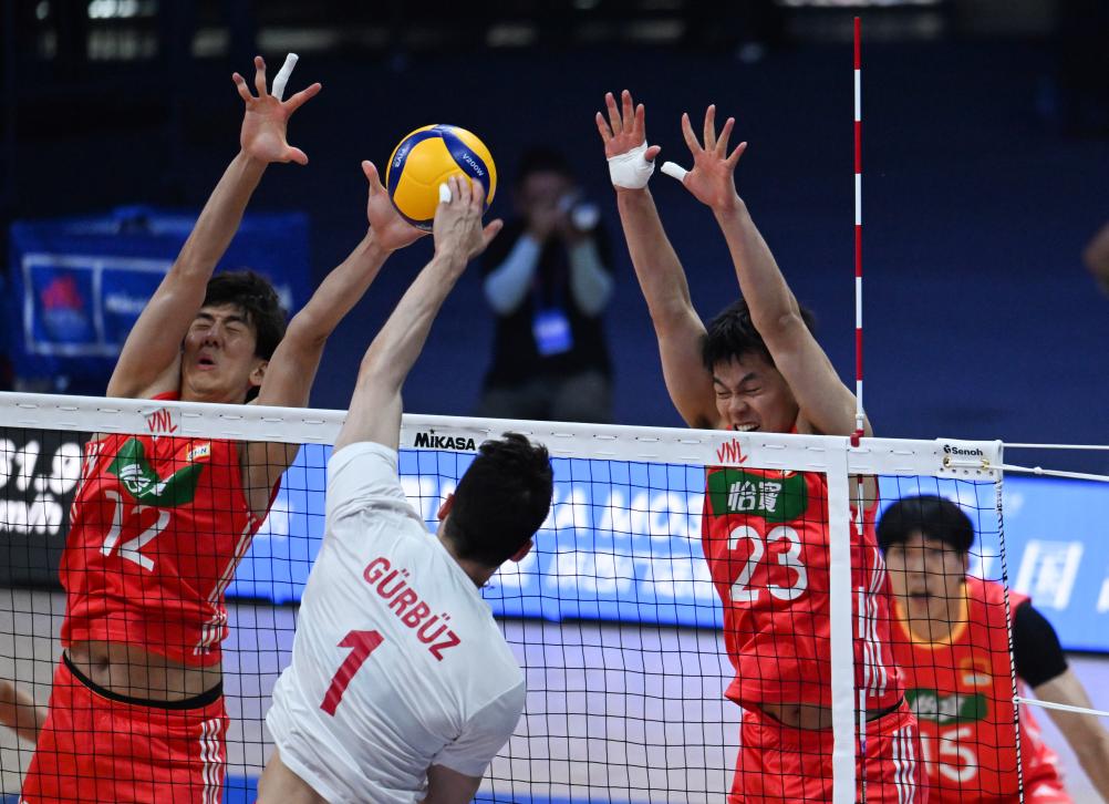 土耳其隊球員穆拉特·葉尼帕扎爾(左)、貝迪爾汗·比比爾在比賽中攔網。新華社記者 張博文 攝