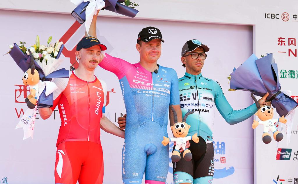 7月9日,賽段冠軍愛沙尼亞快客車隊(duì)車手拉亞斯·馬?。ㄖ校嗆娎顚幹擒囮?duì)車手謝爾比·亞歷山大(左)、季軍意大利巴迪亞尼車隊(duì)車手扎農(nóng)塞洛·恩洛科在領(lǐng)獎(jiǎng)臺(tái)上合影。新華社記者 齊芷玥 攝