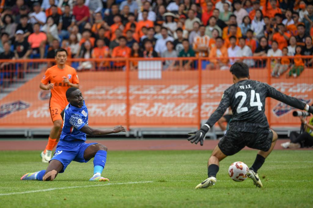 8月2日,成都蓉城隊(duì)球員韋世豪(左)在比賽中射門。新華社發(fā)(尹鋼攝)