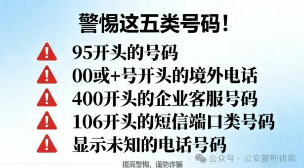 95開(kāi)頭的號(hào)碼,一般為金融、航空、通信等企業(yè)的客服電話(huà),如果接到95開(kāi)頭并且超過(guò)8位數(shù)的電話(huà),可能為境外改號(hào)的詐騙電話(huà)。