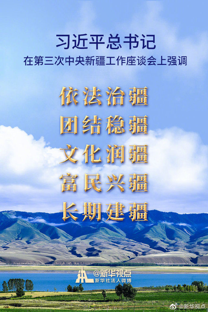 9月25日至26日,第三次中央新疆工作座談會(huì)在北京召開。中共中央總書記、國家主席、中央軍委主席習(xí)近平出席會(huì)議并發(fā)表重要講話。新華社記者 王曄 攝 2014年召開的中央第二次新疆工作座談會(huì)上,習(xí)近平總書記首次提出社會(huì)穩(wěn)定和長治久安是新疆工作的總目標(biāo),并要求堅(jiān)持“依法治疆、團(tuán)結(jié)穩(wěn)疆、長期建疆”。 細(xì)心的人們不難發(fā)現(xiàn),這次座談會(huì)則將有關(guān)要求拓展為“依法治疆、團(tuán)結(jié)穩(wěn)疆、文化潤疆、富民興疆、長期建疆”,增加了“文化潤疆”和“富民興疆”。