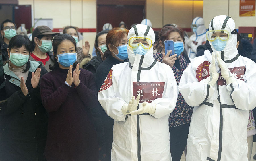 2020年3月8日,女性醫(yī)護(hù)人員和女性患者共同參加武昌方艙醫(yī)院內(nèi)“三八”婦女節(jié)活動(dòng) (新華社記者熊琦 攝)