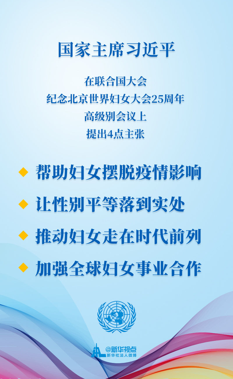 如何落實(shí)《北京宣言》和《行動(dòng)綱領(lǐng)》,以實(shí)際行動(dòng)促進(jìn)男女平等和婦女發(fā)展?習(xí)近平主席提出了四點(diǎn)主張: