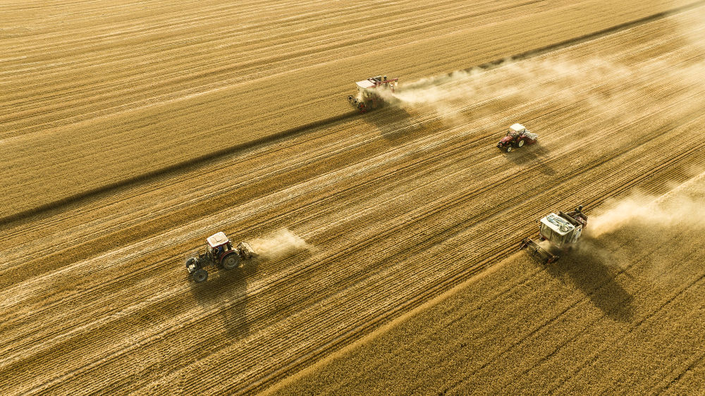 2025年6月4日,在河南省商丘市梁園區(qū)李莊鎮(zhèn)潘堂村志誠(chéng)種植農(nóng)民專業(yè)合作社,農(nóng)機(jī)手操作機(jī)械在農(nóng)田作業(yè)(無(wú)人機(jī)照片)。新華社發(fā)(李恒 攝)