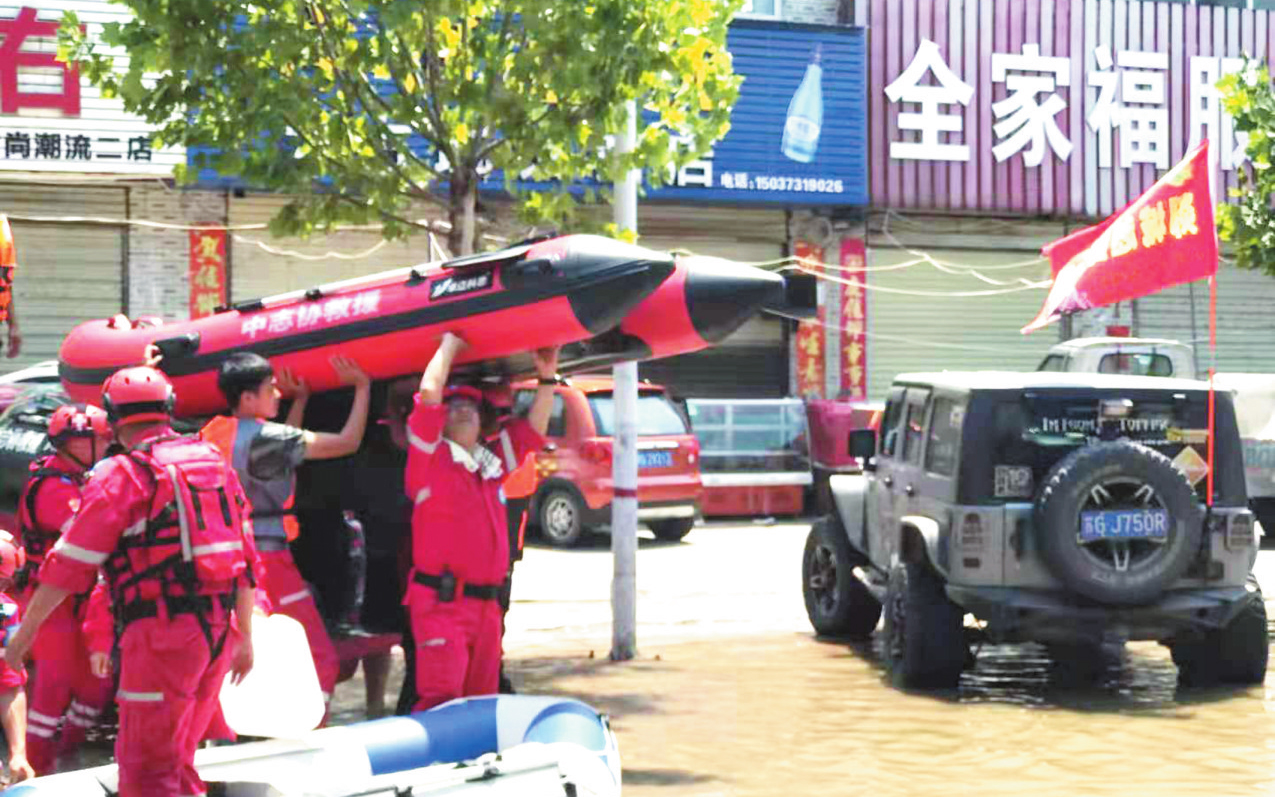 為完成好這次救援任務(wù),該服務(wù)隊準備了救生衣、救生圈、發(fā)電機、迷霧機、救援繩、急救箱、防疫物品等充足的保障物資。24日一早,服務(wù)隊抵達鄭州,之后他們在主管部門統(tǒng)一指揮下展開積極救援。 (王國棟 張蓉 攝影報道)
