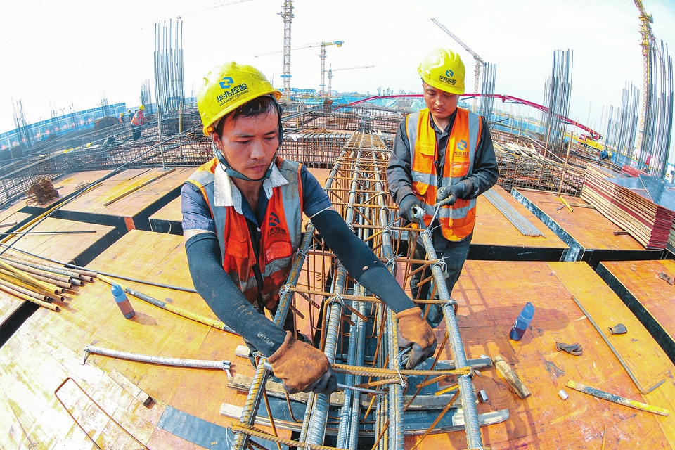 10月1日,建筑工人正在運城市會展中心項目建設工地做基礎(chǔ)施工。國慶長假期間,承建總建筑面積82萬平方米會展中心項目的運城市建工集團200余名建筑工人,堅守施工一線,嚴格按照時間表、路線圖,采取人休機不停的晝夜輪班制施工,確保重點項目的有序推進。(姜樺攝)