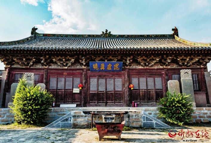 該寺建于高7米的土臺(tái)之上,四周筑高堡圍墻,“踞高而臨深”。寺內(nèi)現(xiàn)存建筑除大殿外,還有東配殿5間,西配房5間,庫(kù)房3間。正殿懸匾“毗廬真境”。面闊5間,七檁六椽,懸山頂花琉璃獸脊。斗拱六鋪?zhàn)鲉纬p下昂,補(bǔ)間斗拱斜拱一朵。