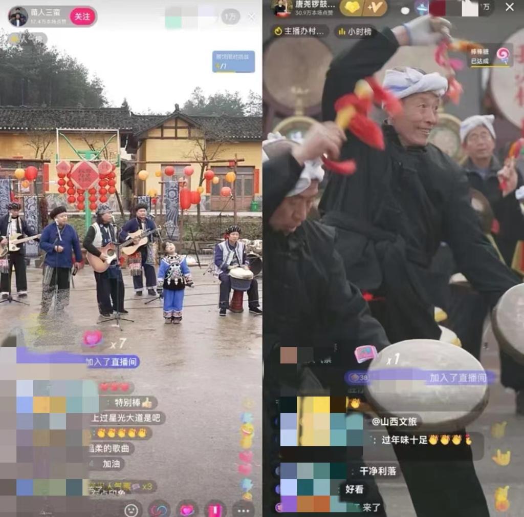 湖南省鳳凰縣臘爾山鎮(zhèn)苗寨中,4個(gè)“90后”苗族小伙組成樂隊(duì)自辦“村晚”,規(guī)模不大,唱火家鄉(xiāng);山西臨汾的村民們用簸箕、黃豆當(dāng)樂器,配合嗩吶和非遺晉南威風(fēng)鑼鼓,直播連線上千公里外的苗鄉(xiāng),南北大聯(lián)歡釋放獨(dú)特的精彩,吸引在線觀眾近800萬人……