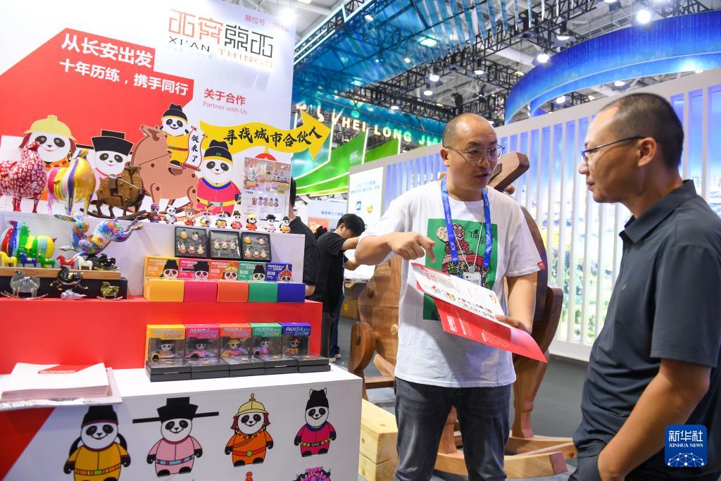 5月23日,參展商在第二十屆文博會(huì)上向參觀者介紹文創(chuàng)產(chǎn)品。(新華社記者 毛思倩 攝)