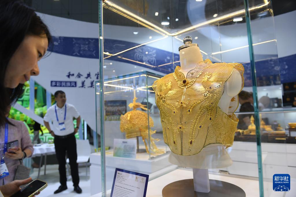 ?5月23日,觀眾在第二十屆文博會(huì)上觀看展出的龍鳳霞帔金衣。(新華社記者 毛思倩 攝)