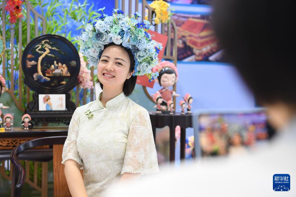 5月23日,參觀者在第二十屆文博會(huì)福建館體驗(yàn)簪花。(新華社記者 毛思倩 攝)
