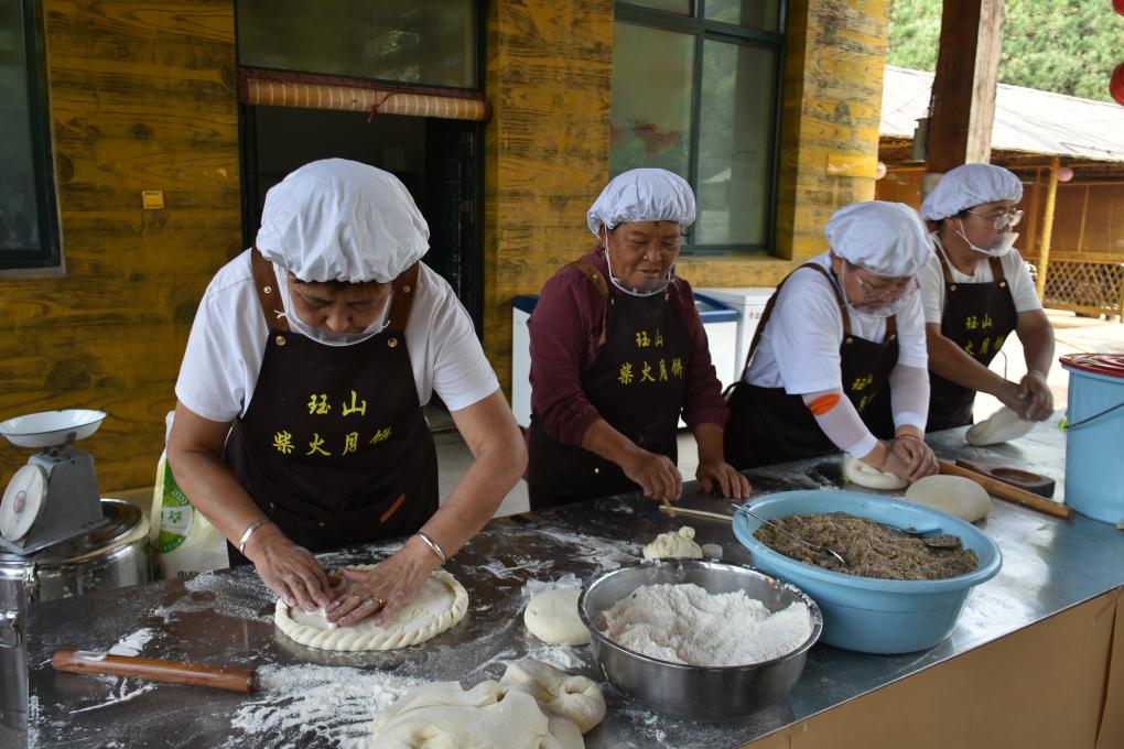 張小女制作的“大團圓”月餅體現(xiàn)了當?shù)靥厣?。澤州粗月餅看上去像一個鎖著花邊的圓形面餅,內(nèi)包兩層冰糖、花生、葡萄干、核桃仁等雜碎餡料,表面裝飾圖案,或蒸或烤而成。講究的圖案比較復雜,但張小女喜歡在村口拔棵野草,洗干凈后,印在上面,充滿野趣。