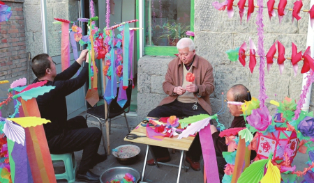 記者在現(xiàn)場(chǎng)看到,制作好的炮燈上有飄帶、繡球等裝飾,每盞炮燈不盡相同,畫有禾苗、動(dòng)物等不同圖案,寓意五谷豐登、六畜興旺,“孔雀展翅”“雄羊抵頭”“駿馬奔馳”等主題的炮燈活靈活現(xiàn)?!霸谖业挠洃浝铮覀兇迥昴甓加兄谱魇止づ跓舻膫鹘y(tǒng),保存好的炮燈能用上兩年,燈架能代代相傳,我們有義務(wù)將這種技藝傳承發(fā)揚(yáng)下去……”67歲的村民翟慶如是村里制作炮燈的“行家”,他現(xiàn)場(chǎng)拿起一張彩紙給記者折起了炮燈上的裝飾。