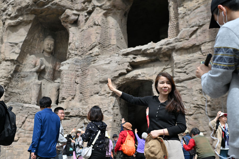 4月16日,在云岡石窟,游客擺出和大佛隔空“擊掌”的姿勢留影。