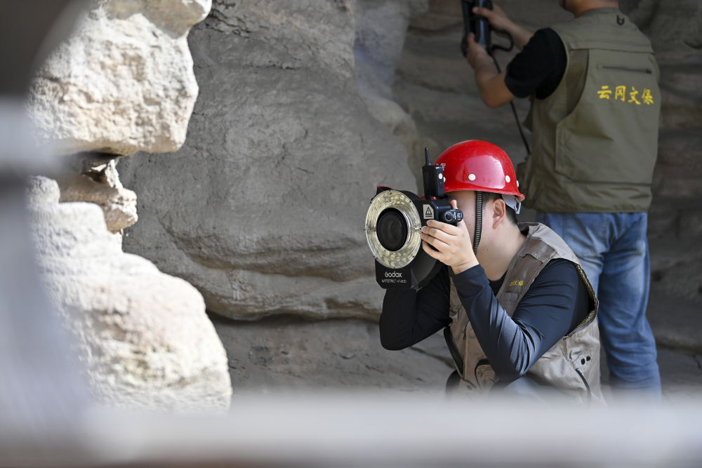 4月16日,云岡研究院數(shù)字化保護中心工作人員王超(左)在云岡石窟進(jìn)行數(shù)字化信息采集。
