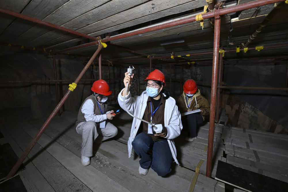 4月15日,來自中國石窟文化聯(lián)合研究生院的山西大學(xué)博士生楊亞娟(中)團隊在云岡石窟進(jìn)行石窟氣溶膠單顆粒采樣。
