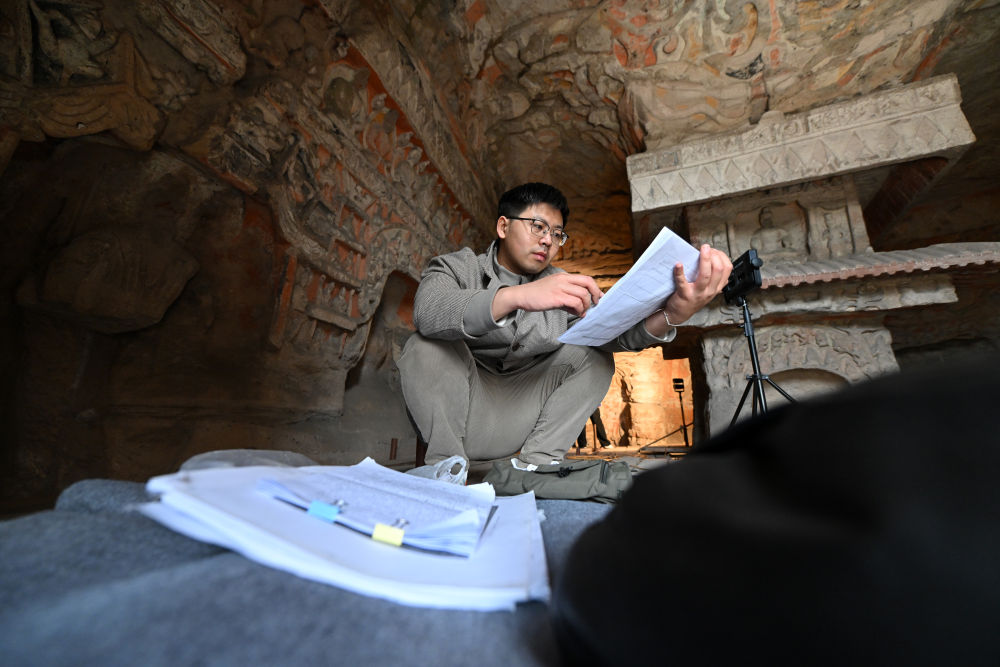 4月16日,在云岡石窟,工作人員在進(jìn)行考古調(diào)查。一支“文物醫(yī)生”團隊