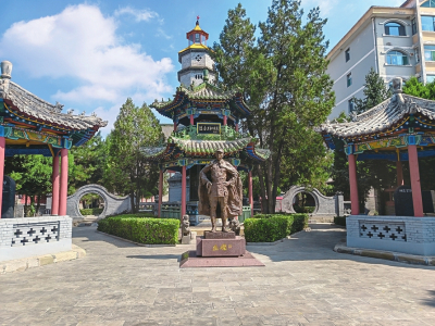 穿過大門,一座約3米高的古銅色左權(quán)將軍塑像巍然屹立。將軍身披軍大衣,目光堅(jiān)定地望向遠(yuǎn)方,仿佛仍在守護(hù)這片曾經(jīng)戰(zhàn)斗過的土地。塑像后方,蒼松翠柏掩映著亭臺廊廡,肅穆之感油然而生。